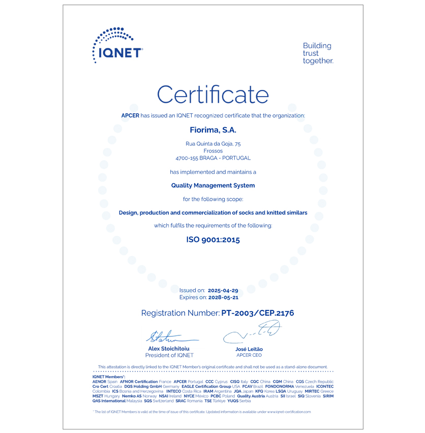 A Fiorima tem o seu Sistema de Gestão da Qualidade certificado de acordo com a norma ISO 9001 desde 2003-12-31.